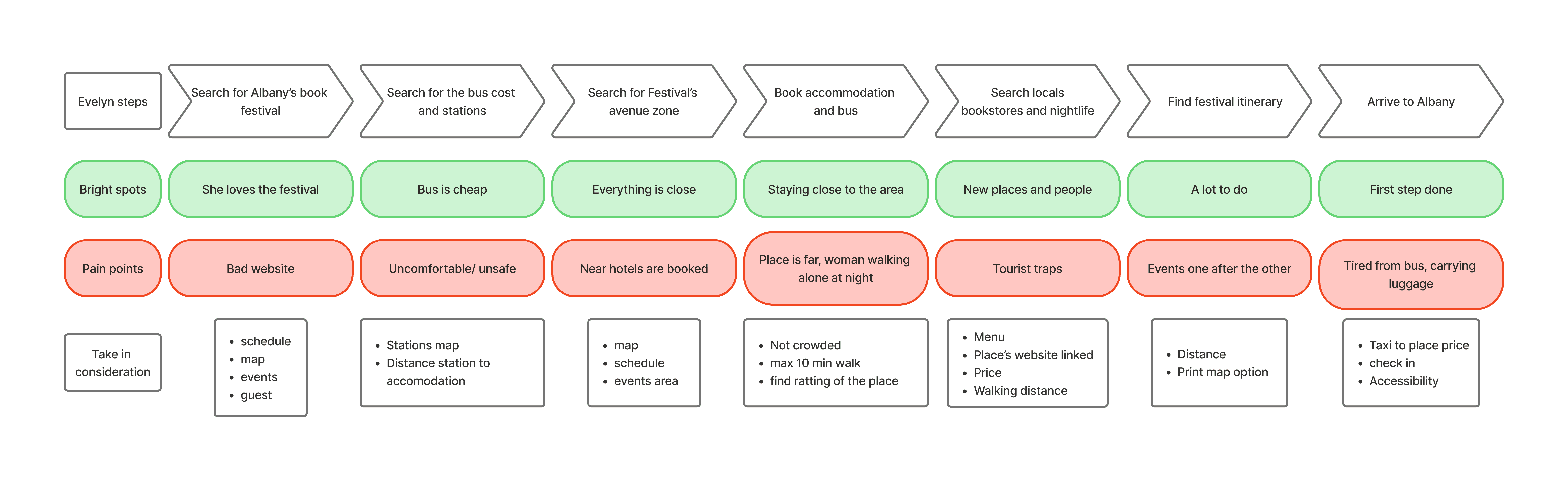 First, I conducted user interviews and secondary research. The interviews helped me understand users’ needs and gather insights that were later translated into journey maps. Since I only had a week and a half to complete the project, I didn’t have enough time to run a full research process. With more time, I would have incorporated surveys and usability testing to better understand the booking experience.